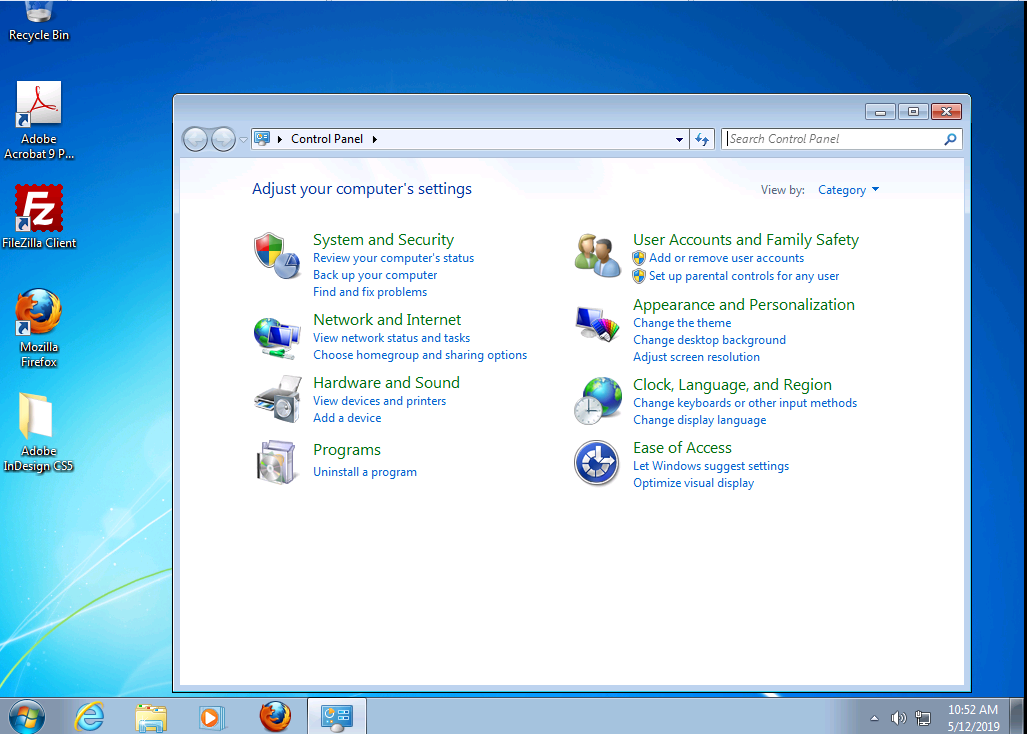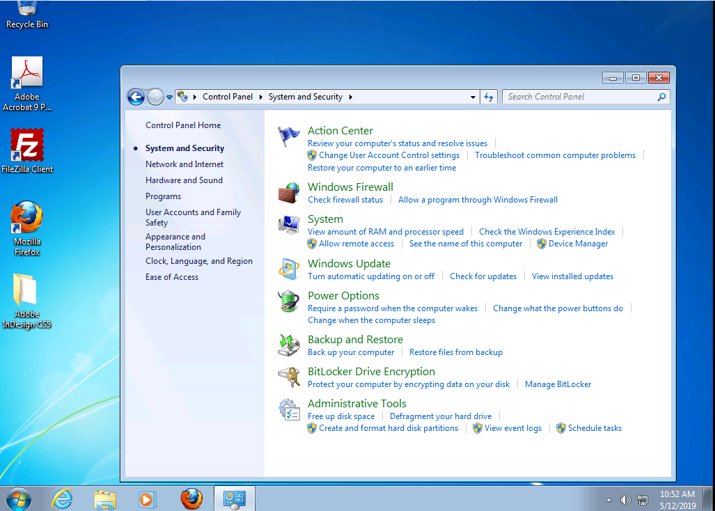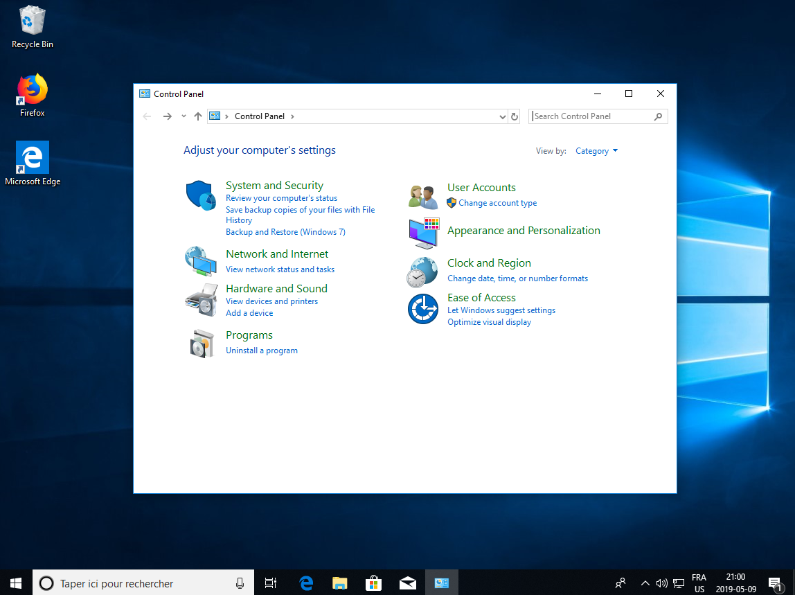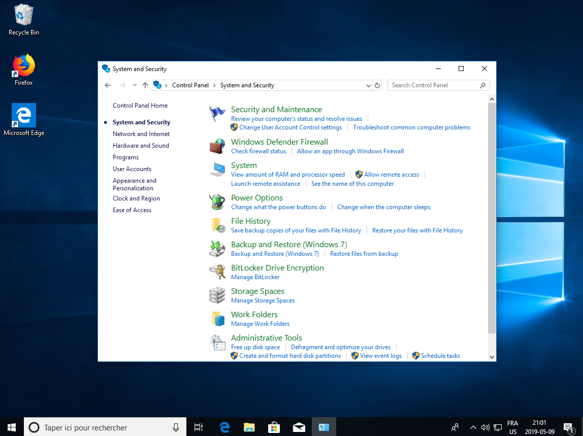 Il affiche la fenêtre du «Control Panel». Vous cliquez alors sur le «System and Security» en vert :