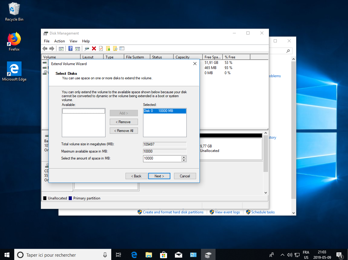 Vous entrez le quantité de Mo que vous souhaitez ajouter à la partition que vous venez d'agrandir, dans notre cas, elle était de 100 Go et est elle a agrandit de 10 Go, donc on indique 10000. Vous cliquez ensuite sur le bouton «Next» :
