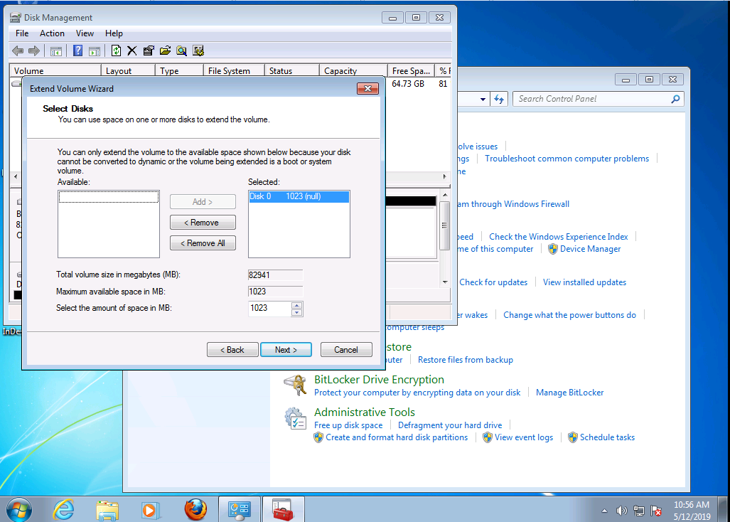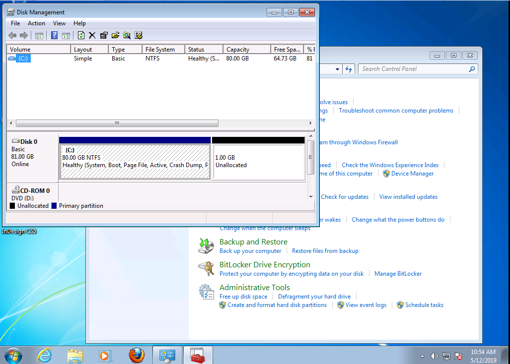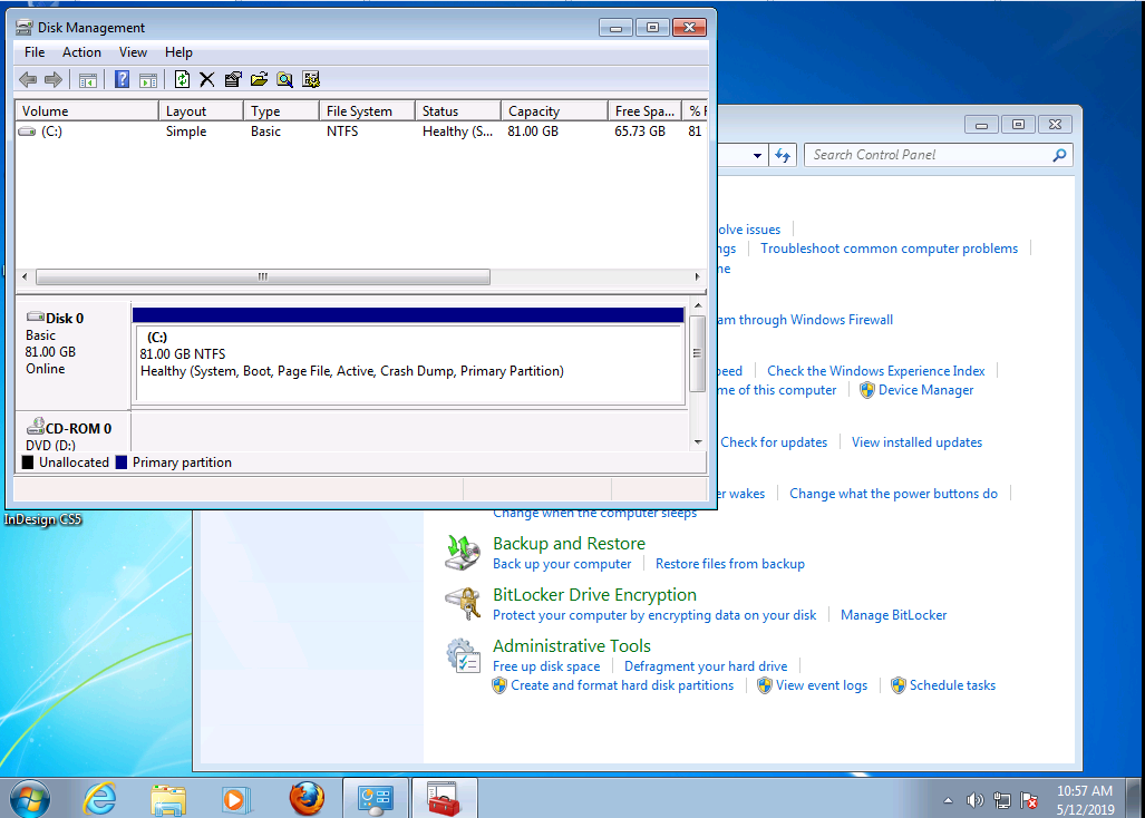 Il affiche les options du «System and Control». Vous cliquez alors sur la petite option discrète «Create and format hard disk partitions» en bas de la liste :
