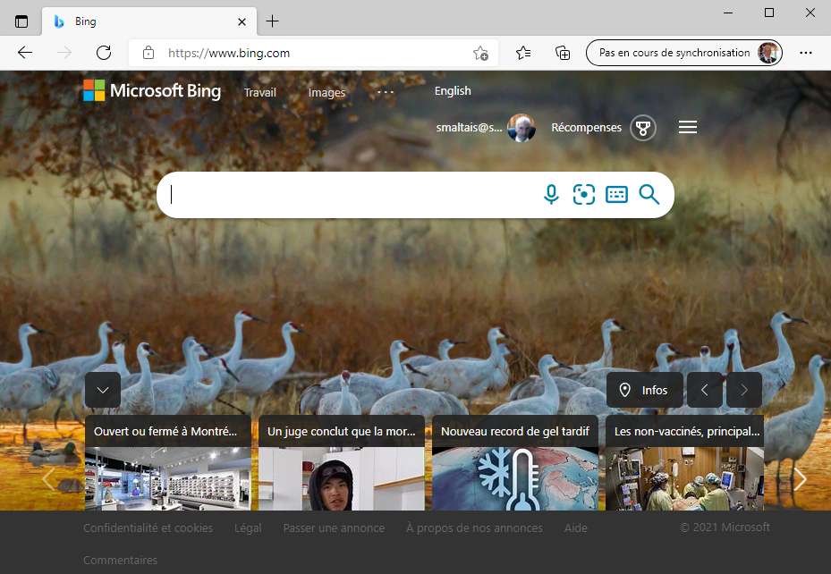 différents onglets tels que les images, les vidéos, les cartes et les actualités. Contrairement à Google, la page d'accueil de Bing présente toujours une image époustouflante et des actualités.