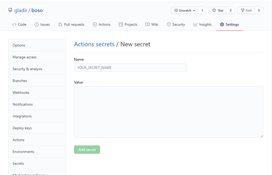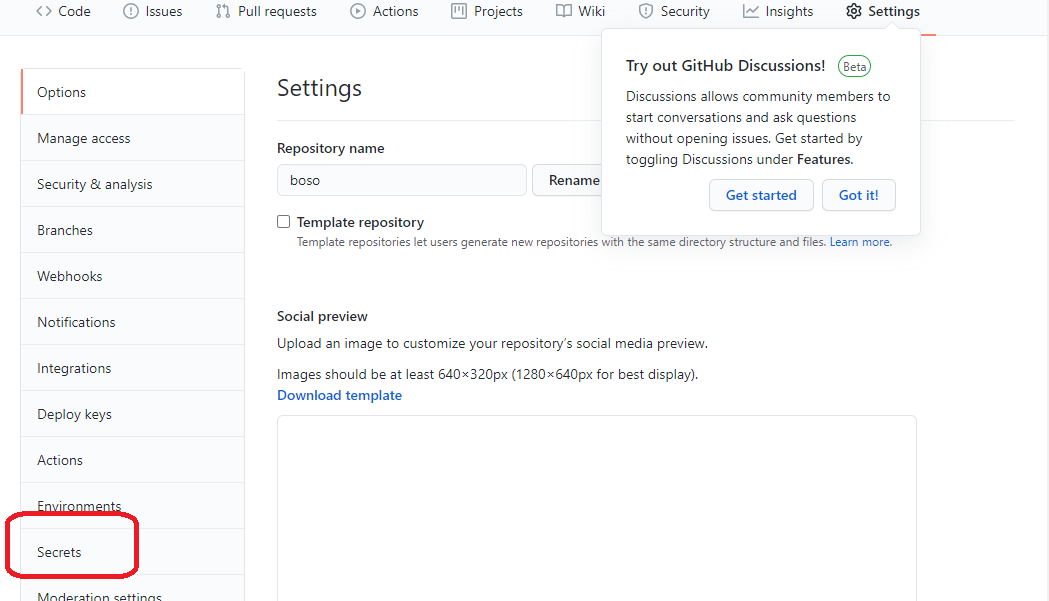 - Dans la barre latérale gauche, cliquez sur Secrets :