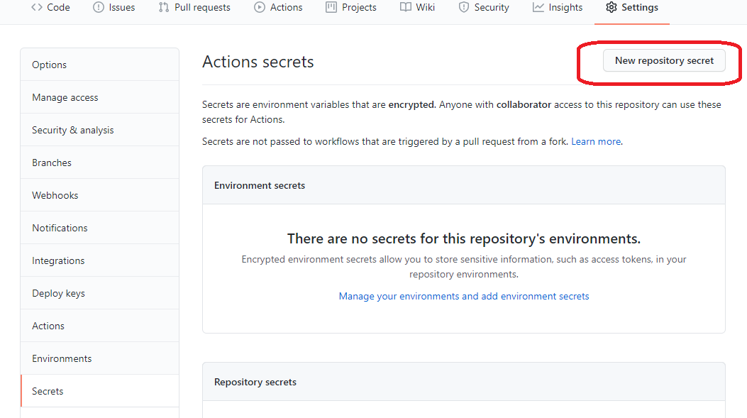 Pour créer des secrets pour un dépôt de compte utilisateur, vous devez être le propriétaire du dépôt. Pour créer des secrets pour un dépôt d'organisation, vous devez disposer d'un accès administrateur.