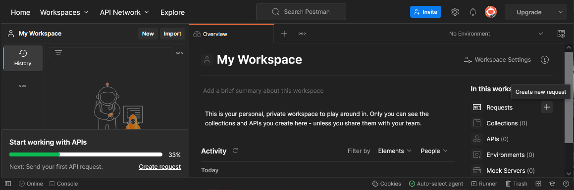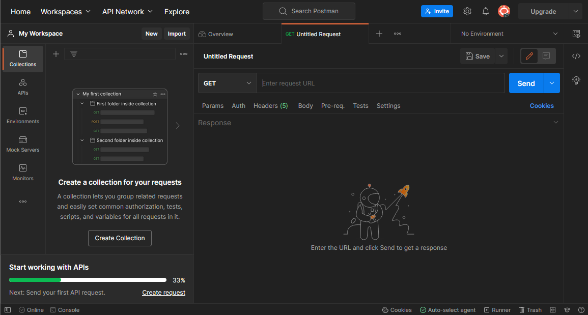 La première fois que vous ouvrez Postman, il vous demandera de vous connecter. Si vous n'avez pas encore de compte Postman, il est fortement recommandé de vous inscrire. Vous pouvez ignorer la connexion, mais la création d'un compte est totalement gratuite, ce qui facilite grandement la gestion et le partage de votre travail. Une fois que vous êtes connecté, vous verrez l'écran principal avec un tas d'options différentes pour les choses que vous pouvez faire avec Postman.