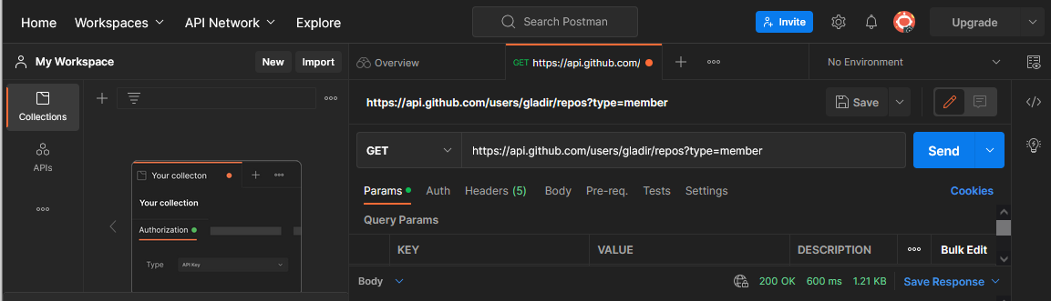 Pour ce point de terminaison, le paramètre de type nous permet de filtrer selon que vous êtes propriétaire d'un référentiel ou simplement d'un membre. Par défaut, le point de terminaison ne renverra que les référentiels dont vous êtes propriétaire, mais si je veux voir tous les référentiels dont je suis membre, je peux mettre un membre dans le champ de valeur pour cela. À ce stade, la requête devrait ressembler à ceci :
