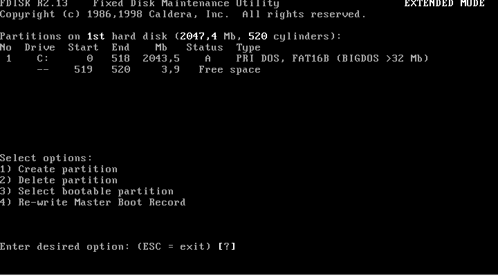 L'exemple suivant permettra de lancer le FDISK en mode étendue :