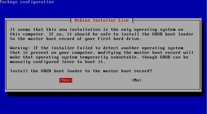 Il vous demande s'il doit installer le gestionnaire de démarrage GRUB. Vous cliquez sur le bouton «Yes» :