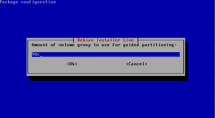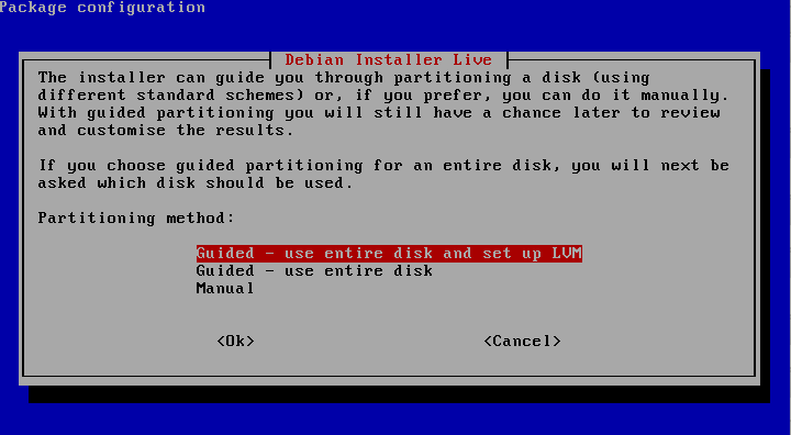 Il vous demande comment il doit installer les partitions du disque dur. Vous choisissez «Guided - use entire disk and set up LVM». Vous cliquez sur le bouton «Ok» :