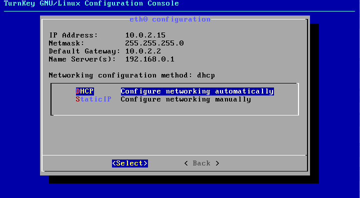Vous choissez la configuration IP automatique avec l'élément «DHCP» ou un IP statique avec l'élément «StaticIP». Ensuite, vous cliquez sur le bouton «Select» :
