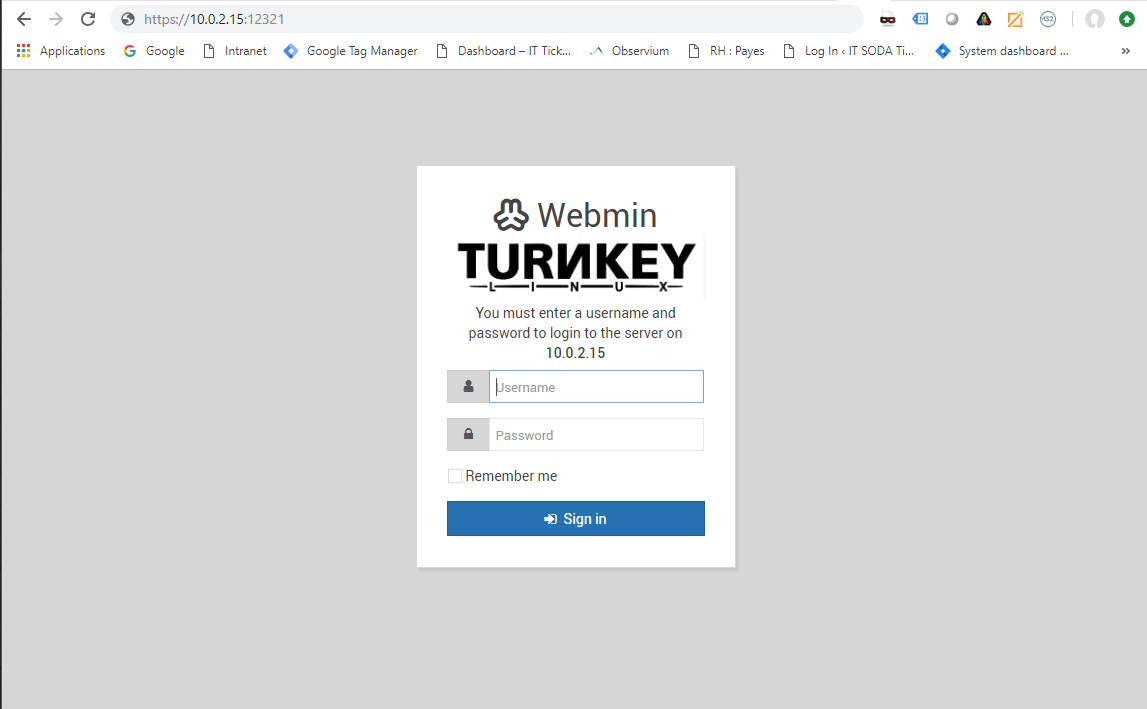 Vous entrez le lien URL avec le port 12321 indiquer que vous avez choisis plus haut dans l'installation. Il affiche la page d'administration Web (Webmin) :
