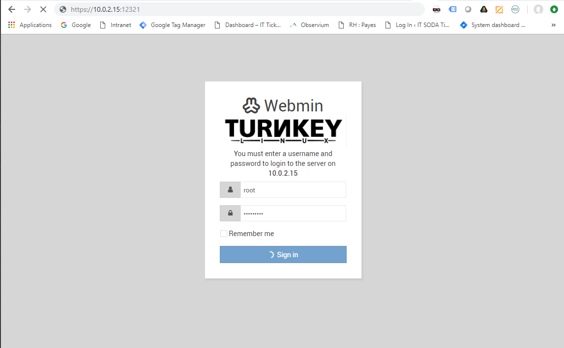Vous entrez «root» et votre mot de passe et vous cliquez sur le bouton «Sign in» :