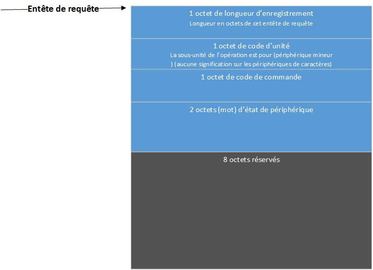 Lorsque le système d'exploitation MS-DOS appelle un pilote de périphérique pour exécuter une fonction, il transmet un entête de requête dans le couple de registres ES:BX au point d'entrée de stratégie. Il s'agit d'un entête de longueur fixe, suivi de données pertinentes pour l'opération en cours. Notez que c'est la responsabilité du pilote de périphérique de préserver l'état de la machine (par exemple, enregistrer tous les registres à l'entrée et les restaurer à la sortie). Il y a assez de place sur la pile quand une stratégie ou une interruption est appelée pour effectuer environ 20 empilements dans la pile. Si plus de pile est nécessaire, le pilote doit configurer sa propre pile. La figure suivante permet de l'illustrer l'entête de requête :