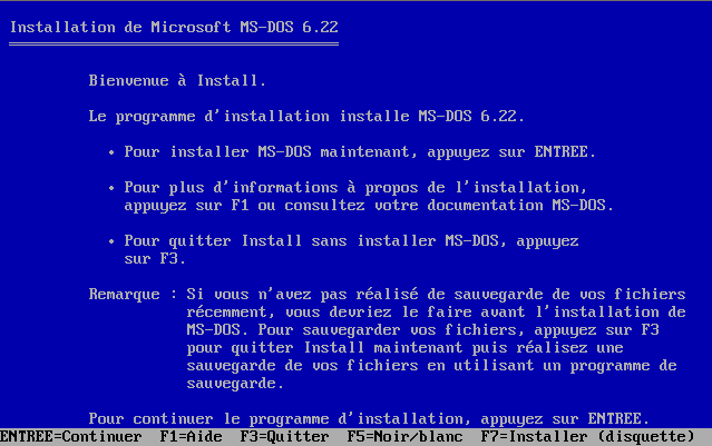 Voici les différentes étapes sur comment installer le système d'exploitation MS-DOS version 6, après avoir démarrer avec la première disquette d'installation et presser la touche «F7» pour commencer :