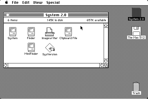 Le système d'exploitation System 2.0 ou Système 2.0 est le successeur du System 1.1 proposé par Apple Computer pour ses micro-ordinateurs Macintosh. L'entreprise Apple a travaillé sur le nouveau système pendant près d'un an avant de le rendre public. Le gros du travail a été fait sur l'amélioration du Finder, étant passé de la version 1.1 à 4.1, alors que le System n'est passé qu'à 2.0. Le Finder était facilement la vedette de ce paquet, maintenant beaucoup plus rapide que jamais, et bourré de nouvelles fonctionnalités. Il peut enfin créer un nouveau dossier à l'aide de la commande New Folder, remplaçant la commande Empty Folder le dossier. Vous pouvez maintenant changer la vue du dossier pour la première fois en "List", ce qui a créé de petites icônes minuscules à côté de leurs noms de fichiers correspondants (un peu comme la vue «Small Icon» aujourd'hui). Vous pouvez également imprimer la liste en utilisant Print Catalog, une nouvelle commande dans le menu File. Le prédécesseur du Chooser, Choose Printer, s'est installé dans le menu Apple. Les utilisateurs pouvaient également désormais fermer leur système d'exploitation à l'aide de la commande du menu Special. L'entreprise Apple permet également aux utilisateurs d'éjecter des disques en les faisant glisser vers la corbeille pour la première fois. Une nouvelle fonctionnalité intéressante appelée MiniFinder est également apparue dans le menu Special. Il permet aux utilisateurs de choisir leurs applications préférées. Ainsi, lorsqu'ils en quittent une, une boîte de dialogue apparaît avec les icônes de toutes les autres qu'ils ont sélectionnées. C'était similaire au Launcher d'aujourd'hui, ou At Ease. Tous les problèmes ultérieurs ont été résolus, à l'exception de la reconstruction du problème du bureau.