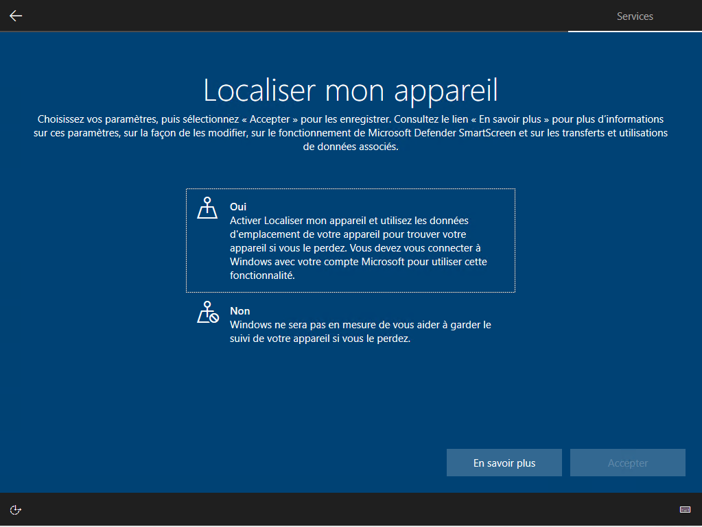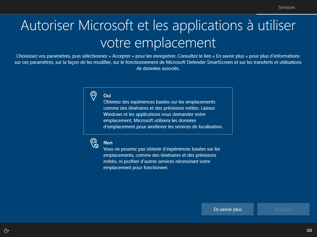 Il vous demande d'autoriser Microsoft a connaître votre position à partir de votre ordinateur. Vous cliquez sur Oui et ensuite sur Accepter :