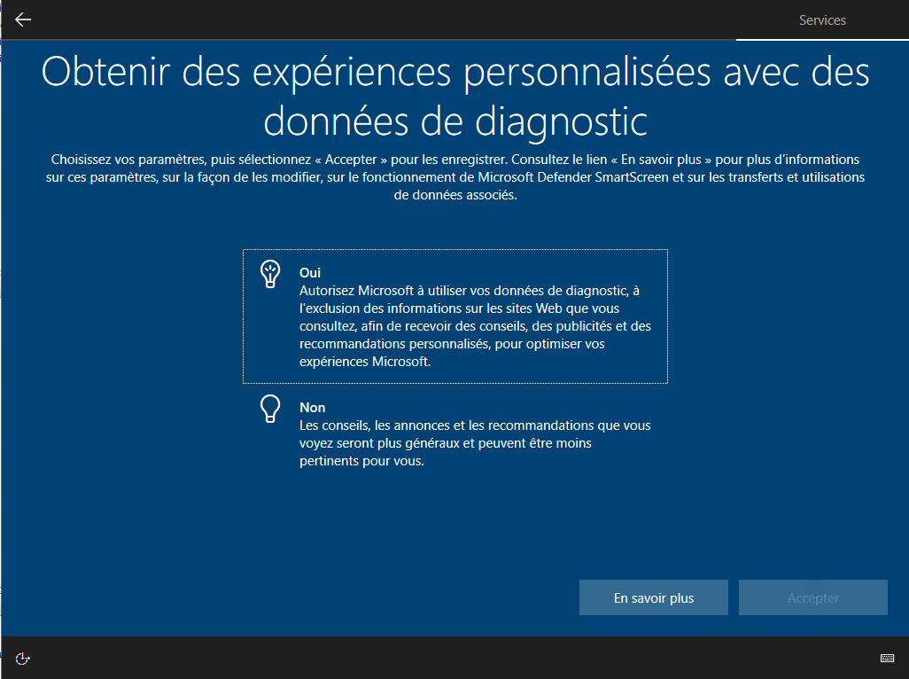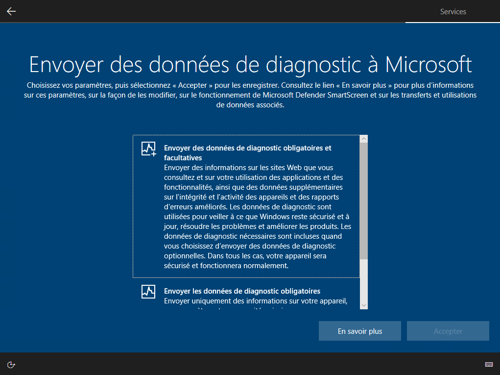 Il vous demande d'autoriser Microsoft a recevoir des information de votre ordinateur pour pouvoir l'améliorer, vous cliquez sur «Envoyer des données de diagnostic obligatoires et facultatives» et ensuite sur le bouton Accepter :