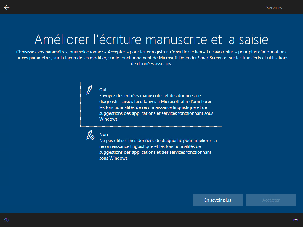 Il vous demande d'autoriser Microsoft d'envoyer des informations linguistique pour que Windows reconnaisse mieux les phrases véhiculés. Vous cliquez sur Oui et ensuite sur Accepter :