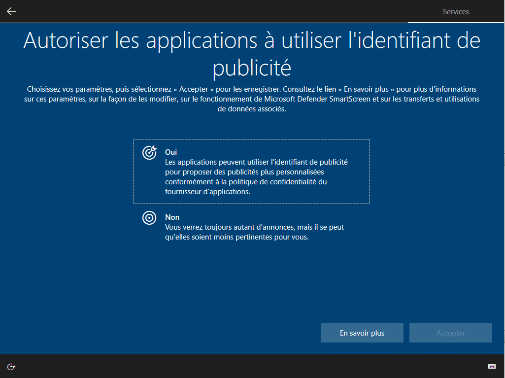 Il permet d'autoriser Windows à mieux cibler les publicités. Vous cliquez sur Oui et ensuite sur Accepter :
