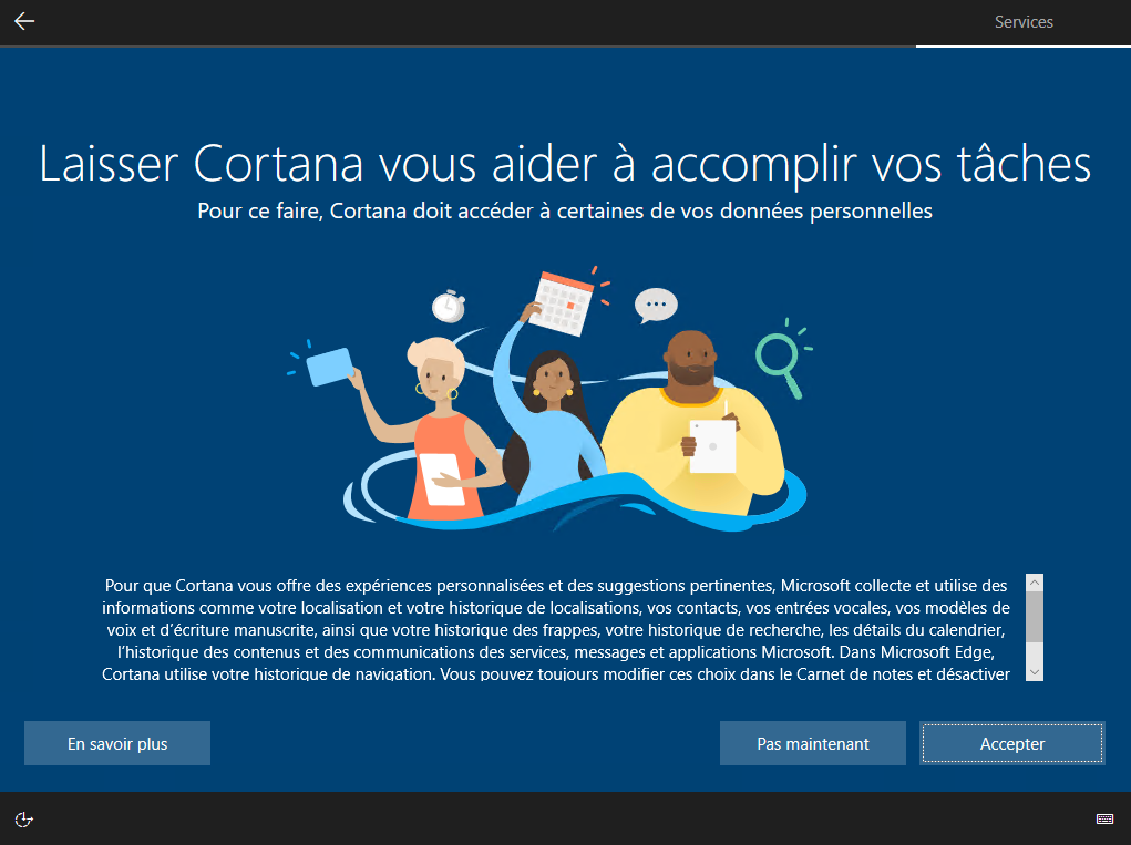 Il vous demande d'autoriser la reconnaissance vocale de Cortana, vous cliquez sur le bouton Accepter :