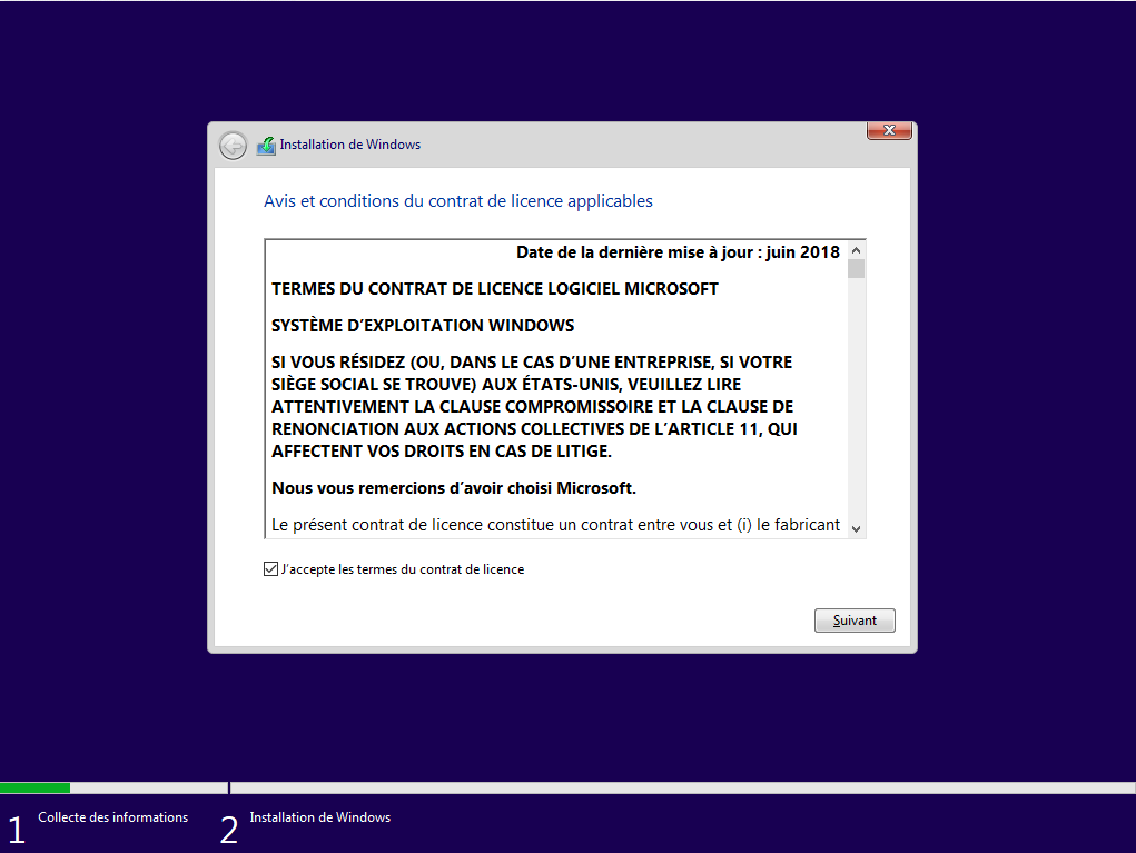 Il affiche les informations en relation avec les droits d'auteurs du produit et la licence de Windows, vous cochez la case «J'accepte les termes du contrat de licence» :