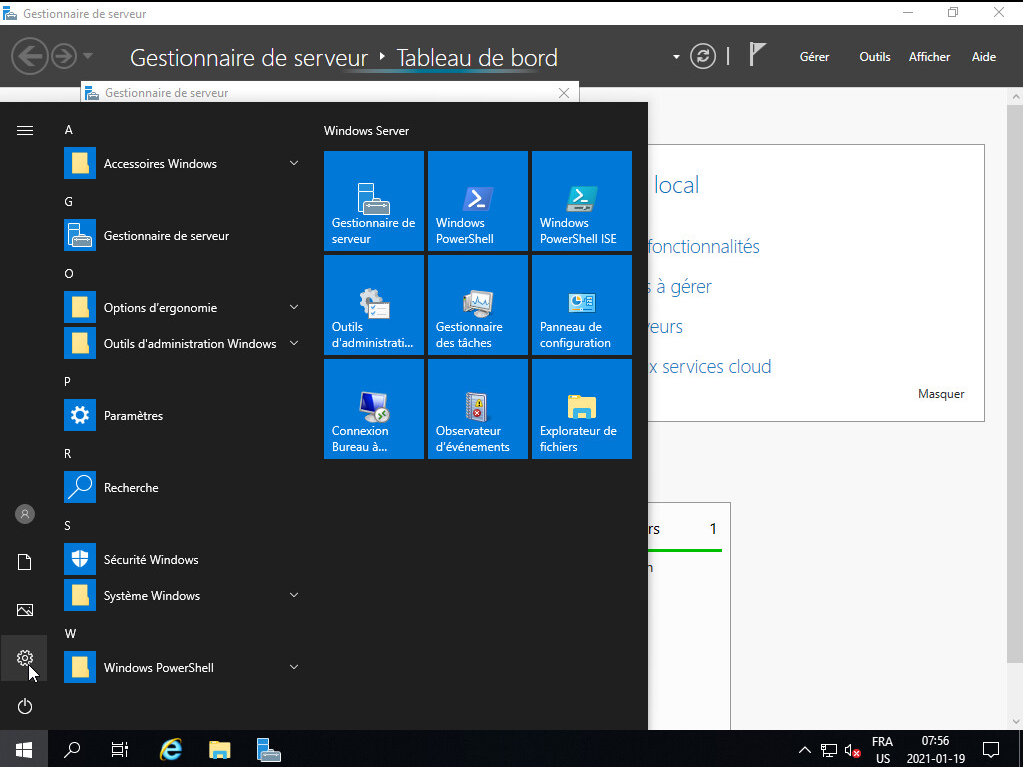Voici les différentes étapes permettant d'activer le bureau à distance (Remote Desktop) sur un serveur Windows Server 2019. Tout, d'abord, cliquez sur le cliquez sur l'icône Windows dans le coin inférieur gauche de l'écran afin d'ouvrir le menu. Ensuite, cliquez sur l'icône de l'engrenage :