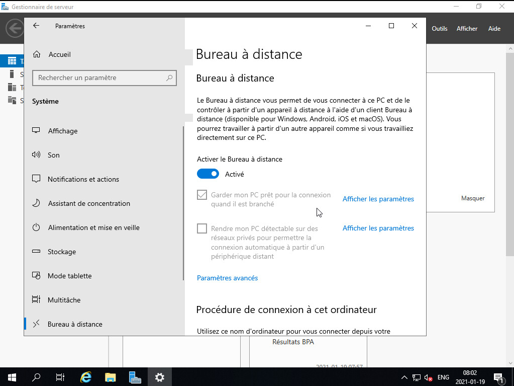 Une fois le bureau à distance activé, le bouton radio devient bleu et votre bureau à distance est immédiatement utilisable :