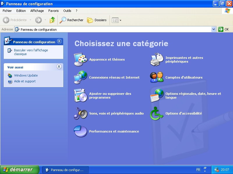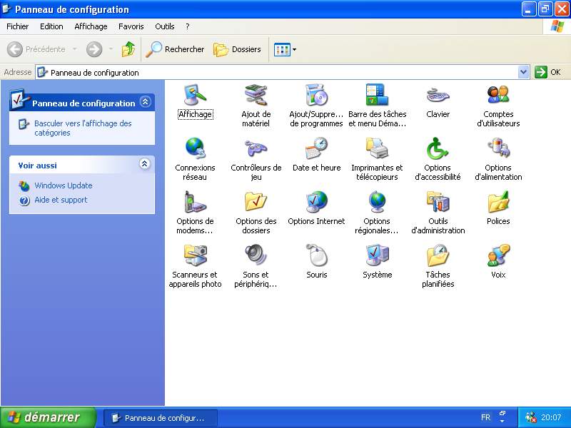 Voici les différents panneau de contrôle (Control Pannel) disponible avec le système d'exploitation Windows XP :