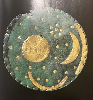 Ces bandes dorées, représentant les solstices, ont été ajoutées au disque après sa fabrication initiale, et dans un cas particulier, l'une de ces bandes recouvrait même l'un des 32 petits points d'or incrustés sur le disque, représentant des étoiles. Parmi ces points, sept forment un amas distinct identifié de manière fiable comme étant les Pléiades, un groupe d'étoiles célèbre dans de nombreuses cultures anciennes. L'identification initiale du grand disque et du croissant d'or semble relativement simple : ils symbolisent respectivement le Soleil et la Lune. Cependant, la position relative de ces symboles ne correspond pas à un phénomène observable dans le ciel réel, puisque le croissant éclairé est placé du mauvais côté par rapport au disque solaire, ce qui intrigue et soulève des questions sur leur signification réelle.