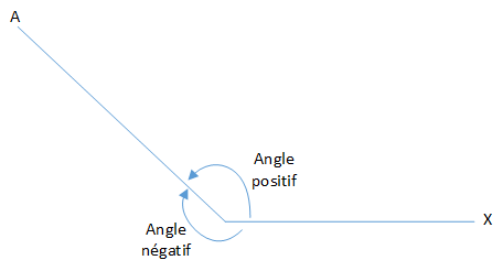 En trigonométrie, un angle X OA est considéré comme généré par la rotation de la ligne OA à partir d'une position initiale OX. L'angle est positif lorsque OA tourne à partir de OX dans le sens inverse des aiguilles d'une montre, et négatif lorsque le sens de rotation de OA est dans le sens des aiguilles d'une montre.