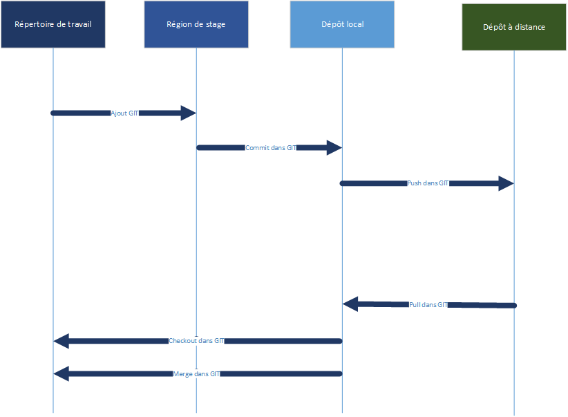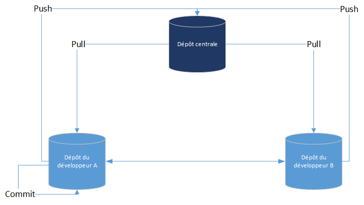 - Les dépôts sont des collections de tous les fichiers nécessaires et de leur historique. Un dépôt se trouver sur une machine locale ou sur un serveur à distance.