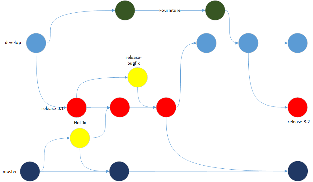 Lorsque vous devez publier un ensemble de fonctionnalités, vous créez une branche de publication, à partir de la branche de développement. Le code de la branche release doit être testé (peut-être avec des correctifs de bogues fusionnés), puis lorsque vous êtes prêt à publier le code, vous fusionnez la branche release dans la branche master, puis dans la branche develop.
