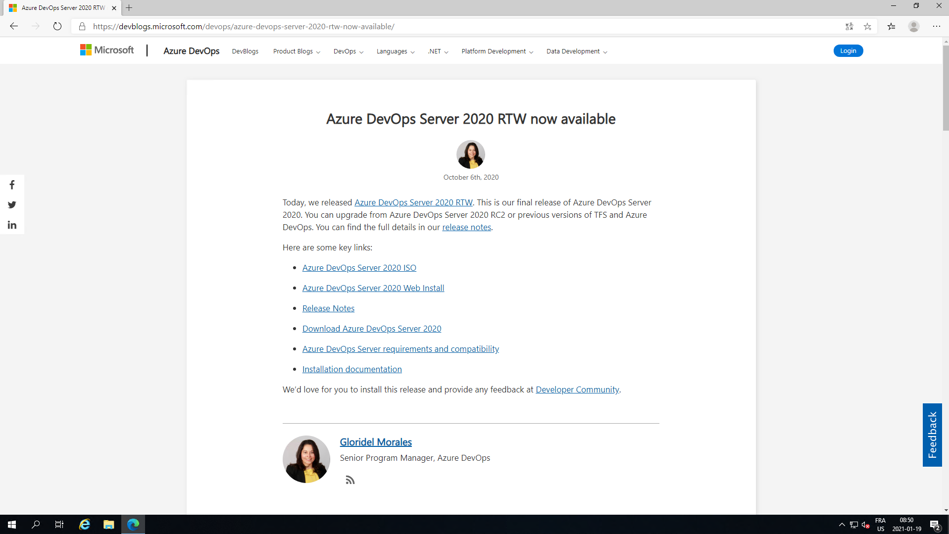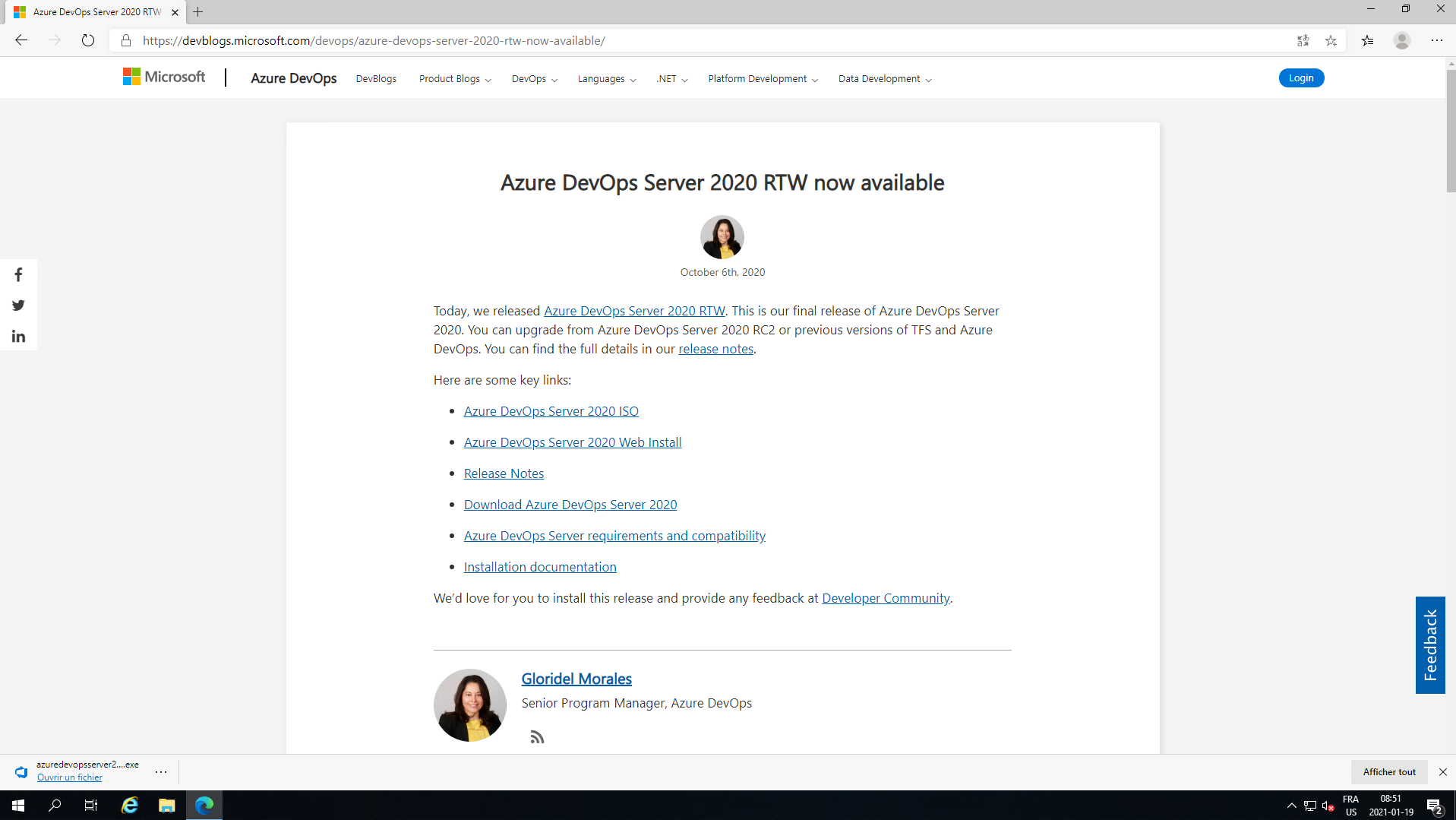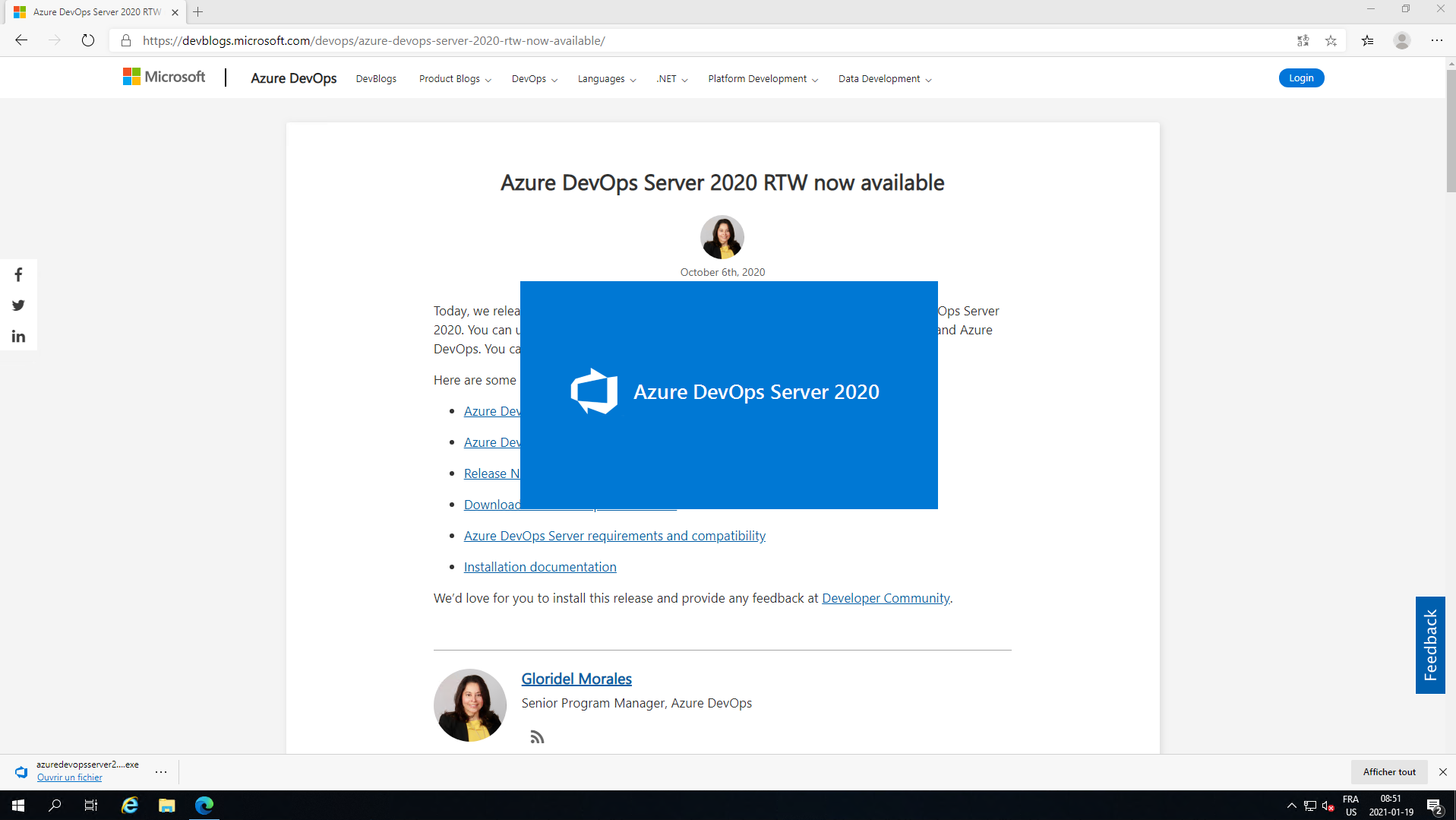 Voici les différentes étapes pour installer le Azure DevOps Server sous le système d'exploitation Windows Server 2019. Tout d'abord, assurez-vous d'avoir installer une version de SQL Server. Tout d'abord, aller sur le site de Microsoft (https://devblogs.microsoft.com/devops/azure-devops-server-2020-rtw-now-available/) afin de télécharger le logiciel en cliquez sur le lien Azure DevOps Server 2020 Web Install :