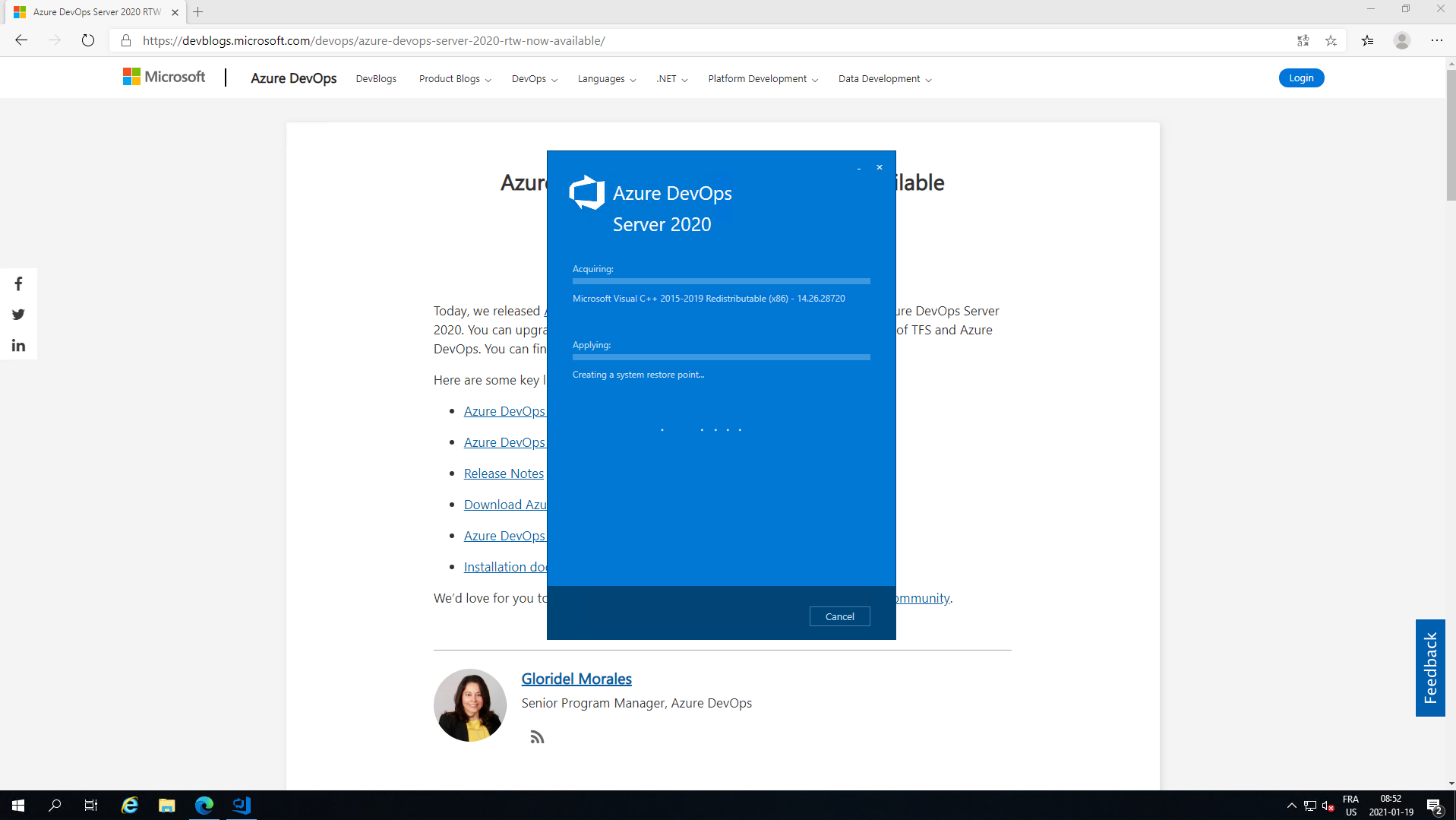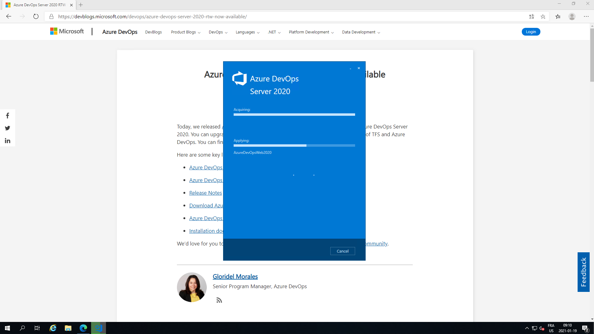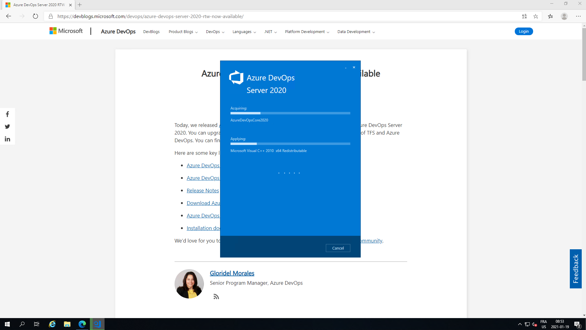 Voici les différentes étapes pour installer le Azure DevOps Server sous le système d'exploitation Windows Server 2019. Tout d'abord, assurez-vous d'avoir installer une version de SQL Server. Tout d'abord, aller sur le site de Microsoft (https://devblogs.microsoft.com/devops/azure-devops-server-2020-rtw-now-available/) afin de télécharger le logiciel en cliquez sur le lien Azure DevOps Server 2020 Web Install :
