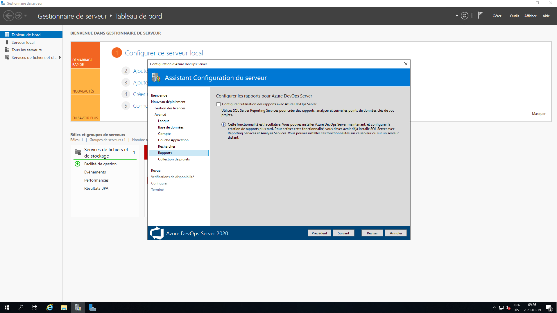 Il vous indique les paramètres de rapport de Azure DevOps Server, et vous cliquez sur Suivant :