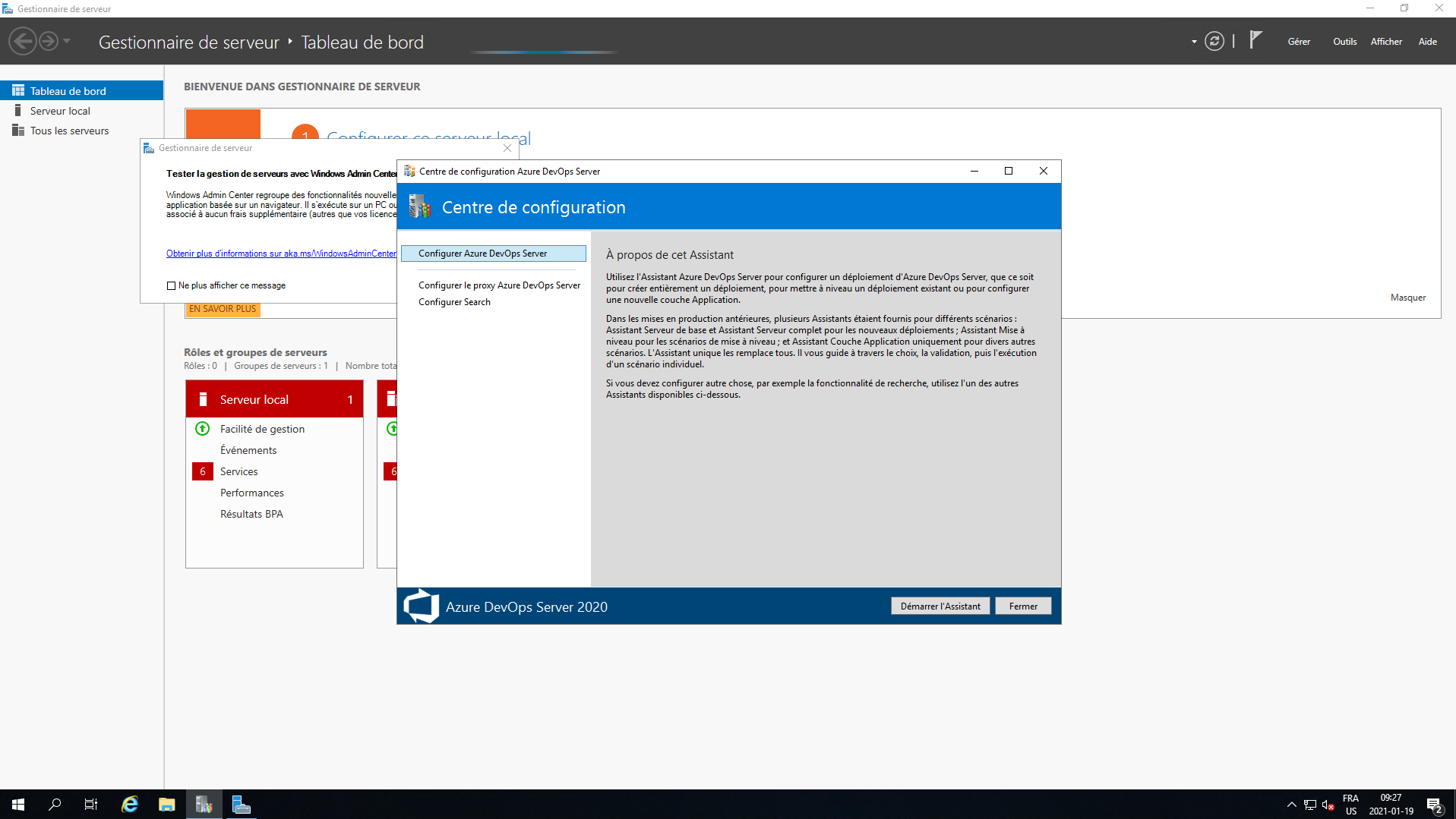 Après avoir redémarrer le serveur, le «Centre de configuration Azure DevOps Server» s'affiche. Vous cliquez sur le bouton Démarrer l'Assistant :