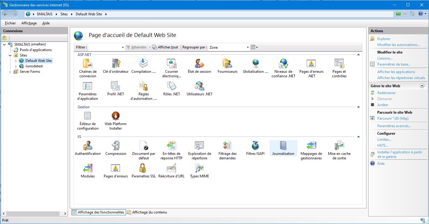 - Démarrez le Gestionnaire des services Internet (IIS), puis dans le volet Connections (Connexions en français) à gauche, cliquez sur le site Web approprié sur lequel vous souhaitez activer la journalisation XFF. La page d'accueil s'affiche alors dans le panneau principal.