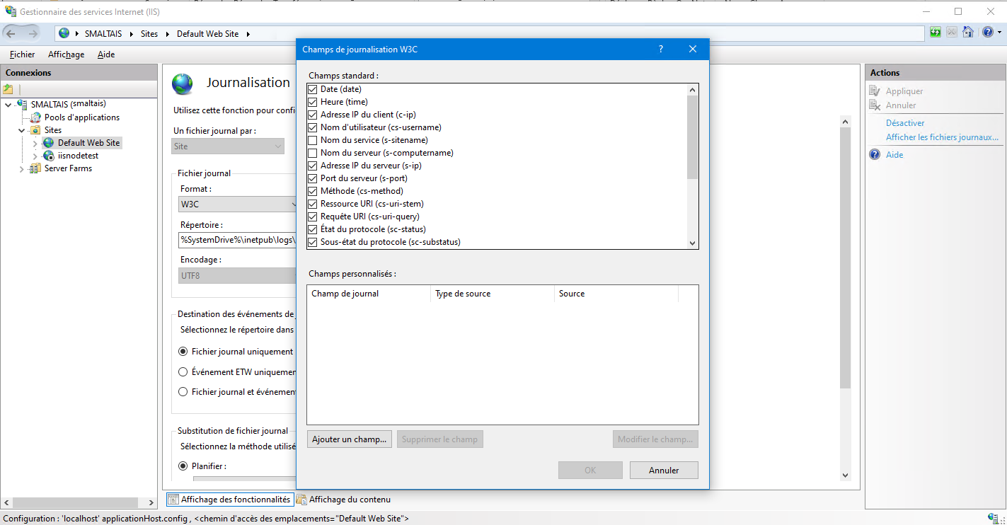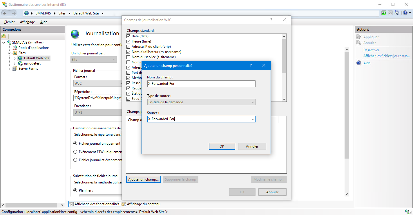 Un champ de journalisation personnalisé peut être ajouté pour enregistrer les entêtes XFF. Pour activer cette fonctionnalité sous IIS 8.5 ou supérieur :