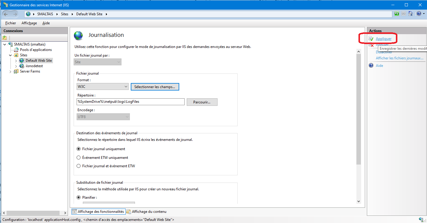 - Dans le volet Actions sur la droite, cliquez sur Apply (Appliquer en français) pour mettre en oeuvre la modification.