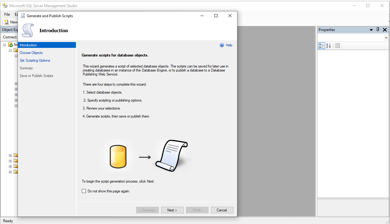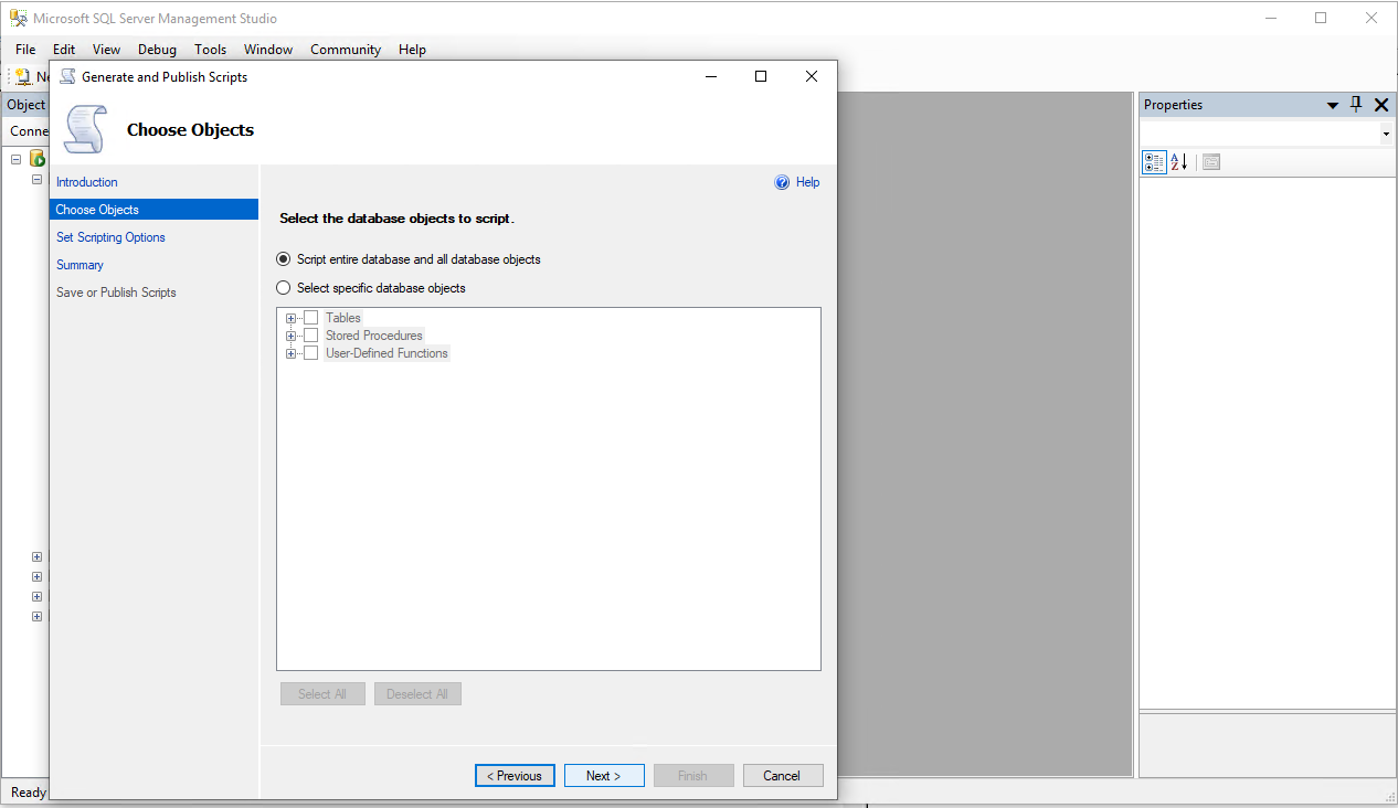 Vous sélectionnez le bouton radio «Script entire database and all database objects» et vous cliquez sur le bouton «Next» :