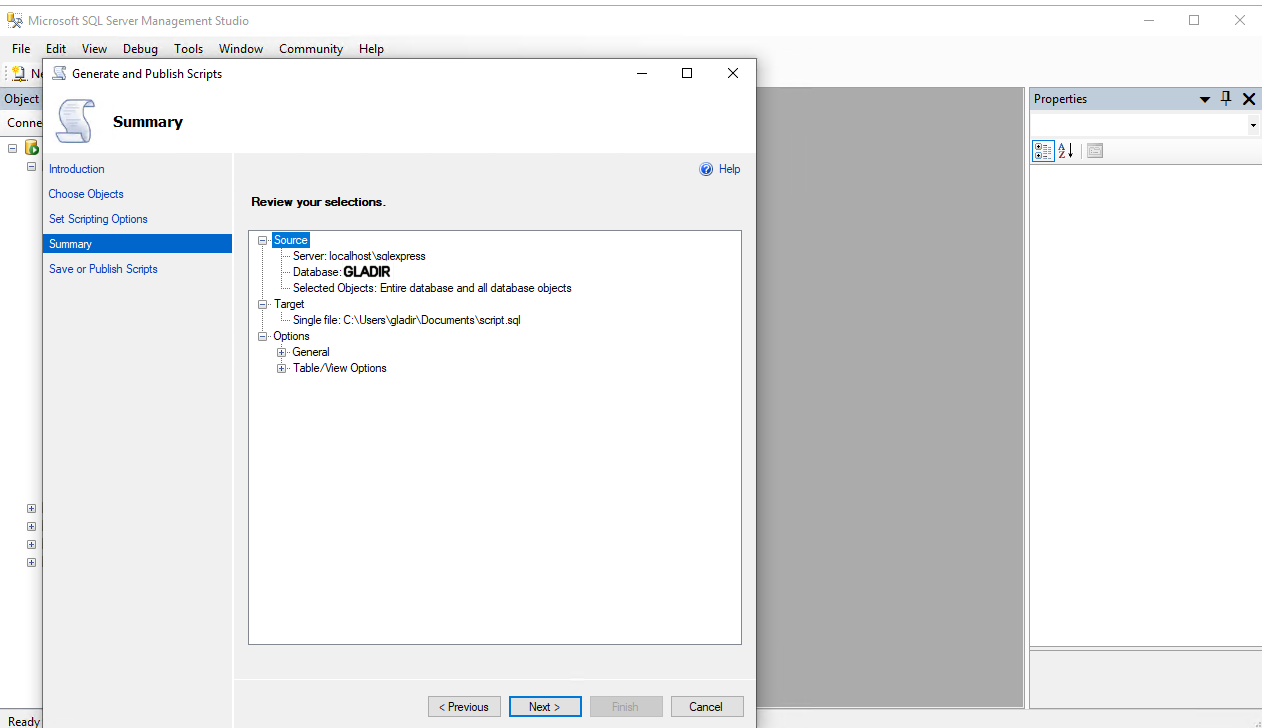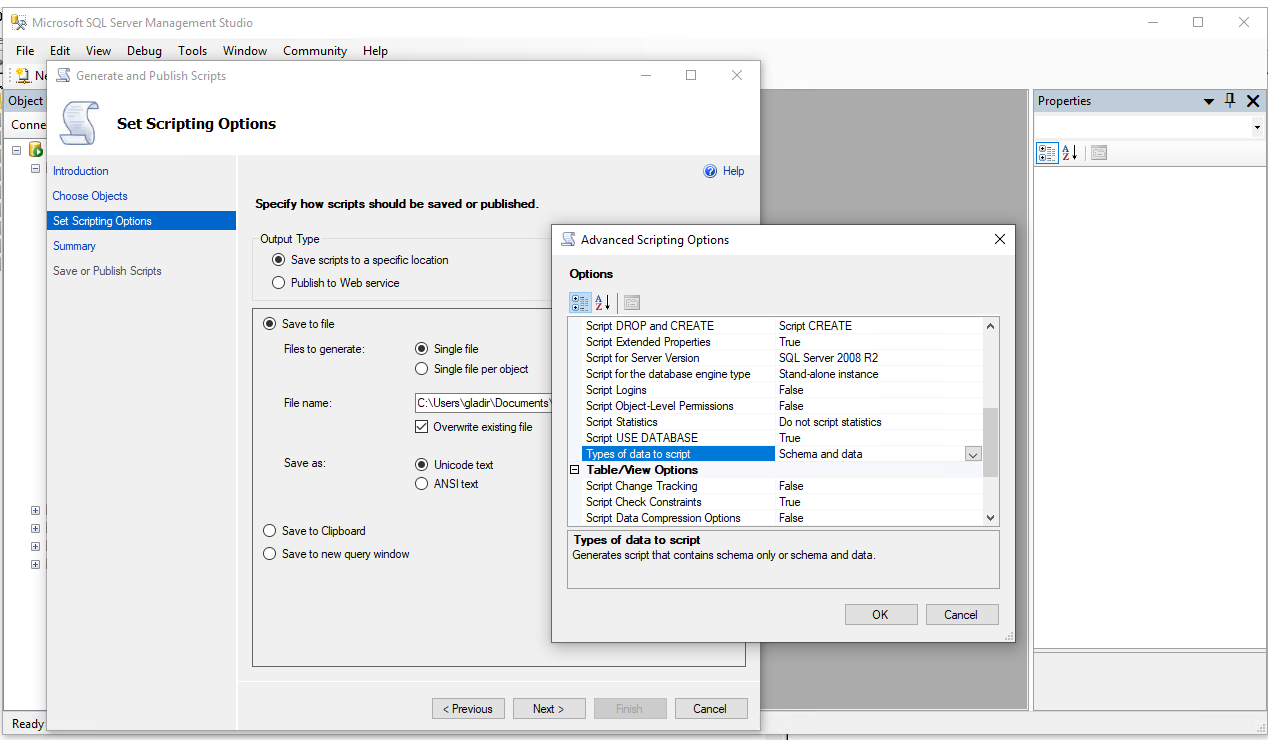 Vous descendez dans la liste et vous changez l'option «Types of data to script» pour «Schema and data» afin d'avoir les requêtes INSERT du SQL inclus dans le fichier .SQL et vous cliquez sur le bouton «Ok», la fenêtre se ferme et vous cliquez sur le bouton «Next» :