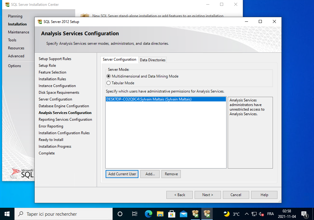 Vous sélectionnez le bouton radio «Multidimensional and Data Mining Mode», vous cliquez sur le bouton Add Current User et vous cliquez sur le bouton Next :