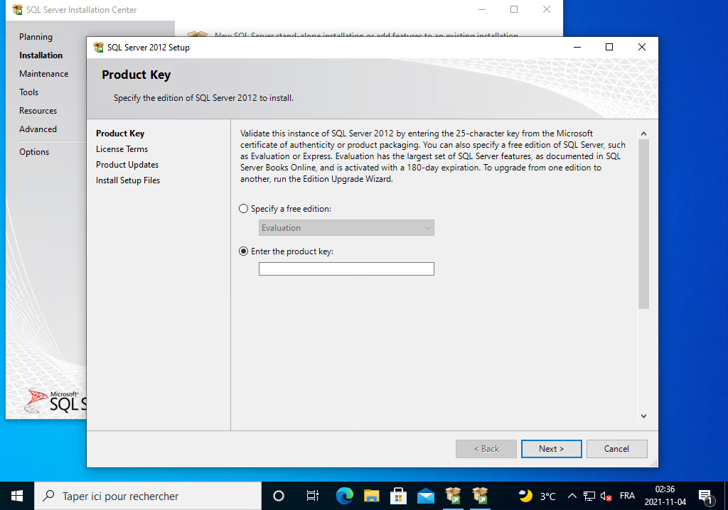 Il affiche une boite de dialogue sur pour entrez votre clef d'enregistrement. Pour la version SQL Server 2012 Developer, il entre automatiquement une clef de produit. Vous n'avez qu'à cliquez sur le bouton Next :