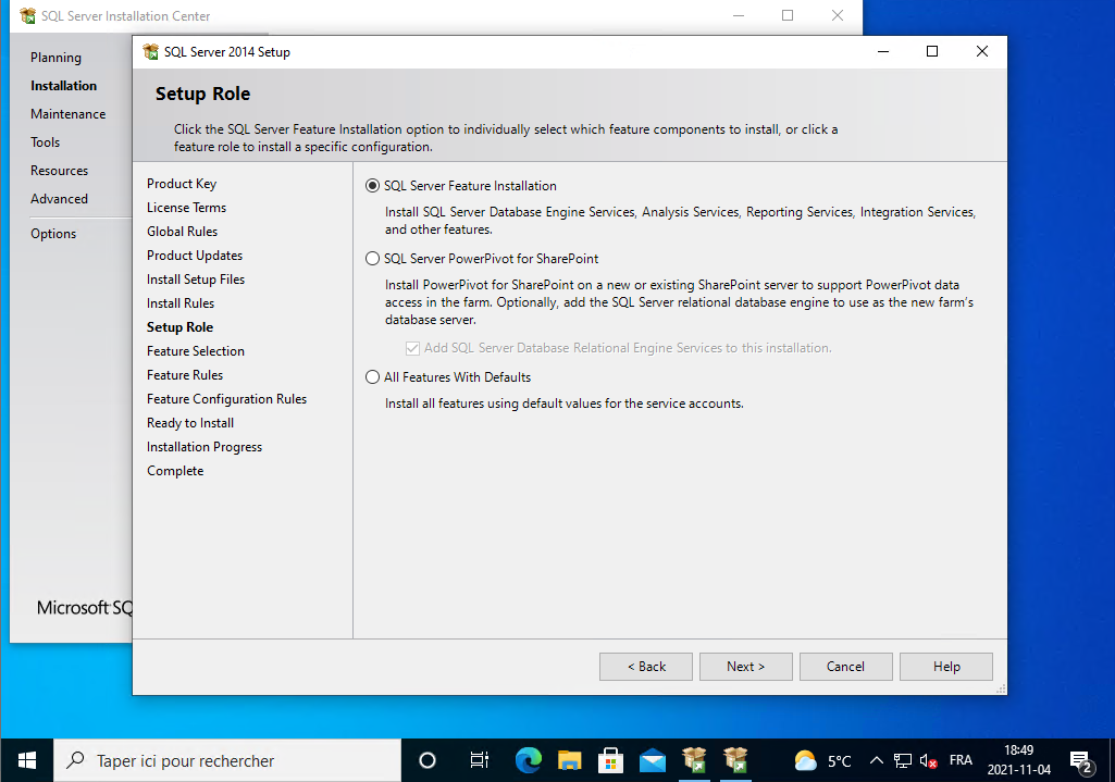 Vous sélectionner le bouton radio «SQL Server Feature Installation» et vous cliquez sur le bouton Next :