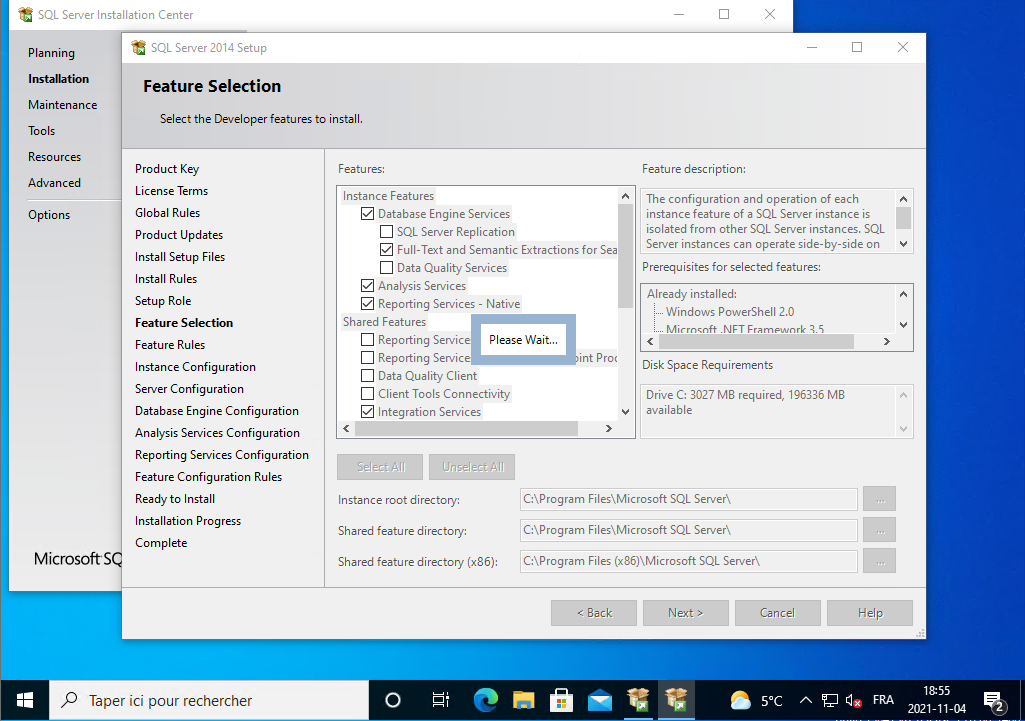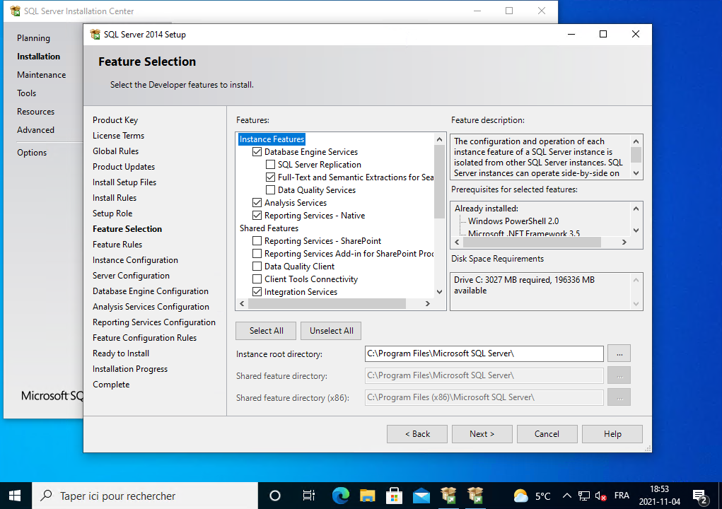 Il affiche des options de personnalisation d'installation, vous cocher «Full-Text and Semantic Extractions for Search», «Analysis Services», «Reporting Services - Native», «SQL Server Data Tools» et «Integration Services» et vous cliquez sur le bouton Next :