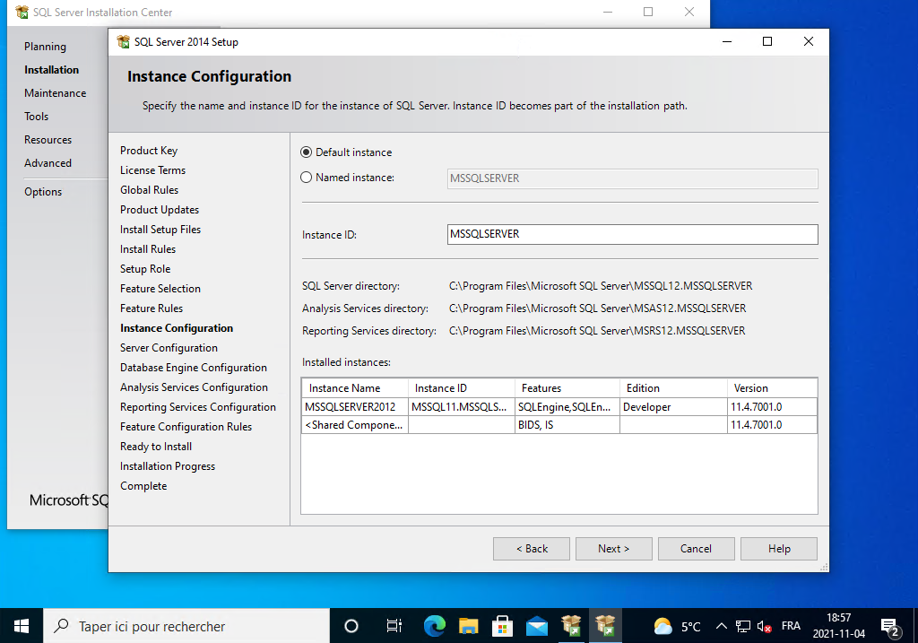 Vous sélectionnez le bouton radio «Default instance» et vous cliquez sur le bouton Next :