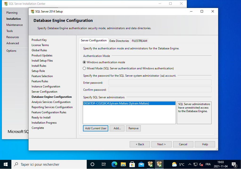 Vous sélectionnez le bouton radio «Windows authentication mode», vous cliquez sur le bouton Add Current User et vous cliquez sur le bouton Next :