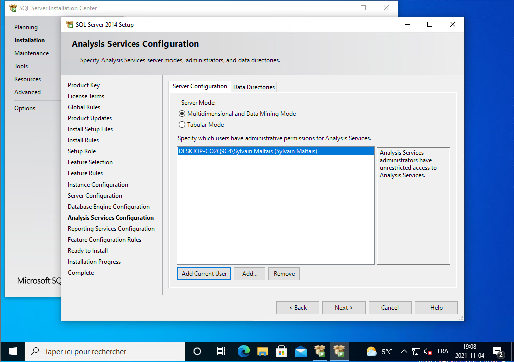 Vous sélectionnez le bouton radio «Multidimensional and Data Mining Mode», vous cliquez sur le bouton Add Current User et vous cliquez sur le bouton Next :