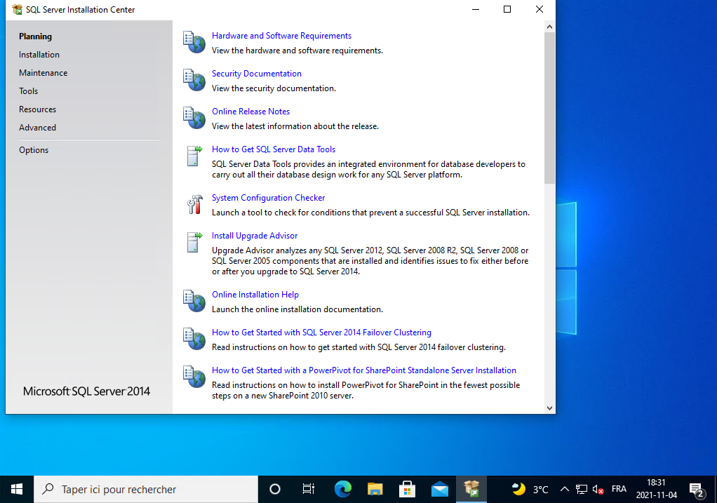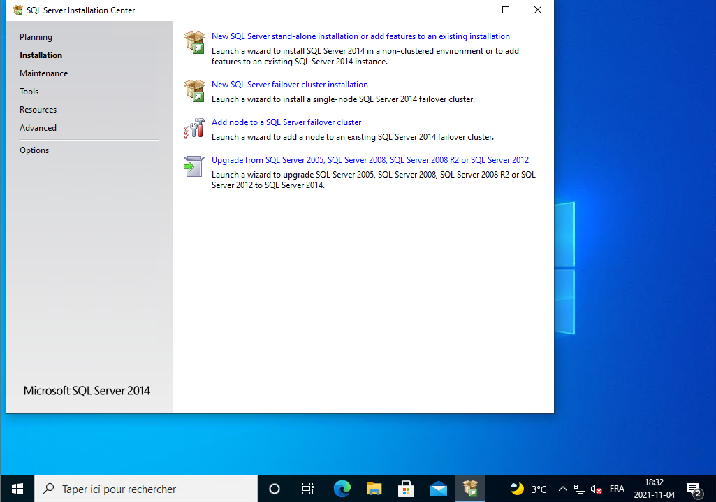 Vous cliquez sur le premier option de la colonne de droite, soit «New SQL Server stand-alone installation or add features to an existing installation» :