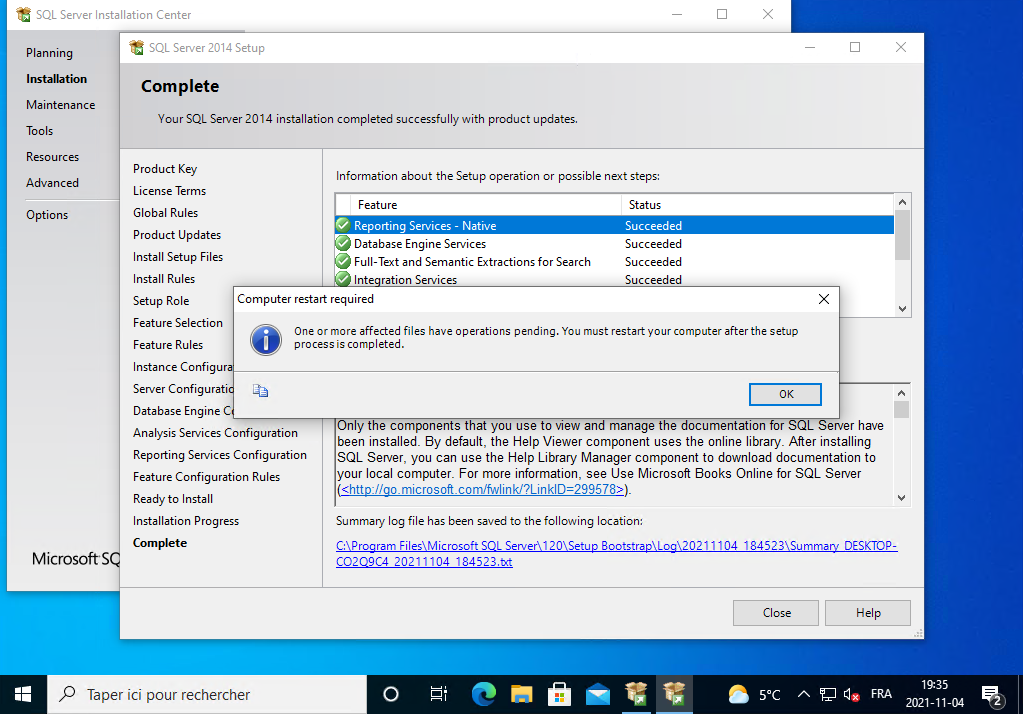 Il vous indique qu'il va probablement falloir redémarrer Windows, vous cliquez sur le bouton OK :