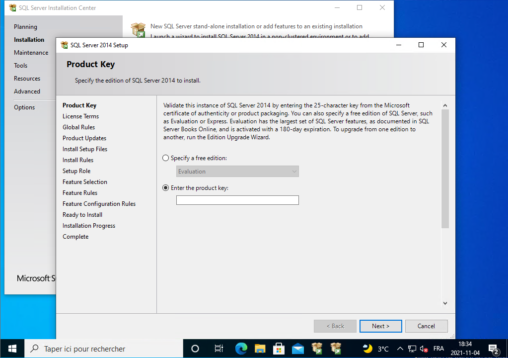 Il affiche une boite de dialogue sur pour entrez votre clef d'enregistrement. Pour la version SQL Server 2014 Developer, il entre automatiquement une clef de produit. Vous n'avez qu'à cliquez sur le bouton Next :