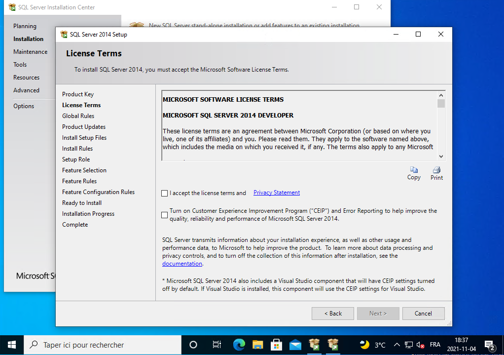 Il affiche le contrat de licence. Vous cliquez sur la case à cocher «I accept the licence terms and Pricacy Statement» :